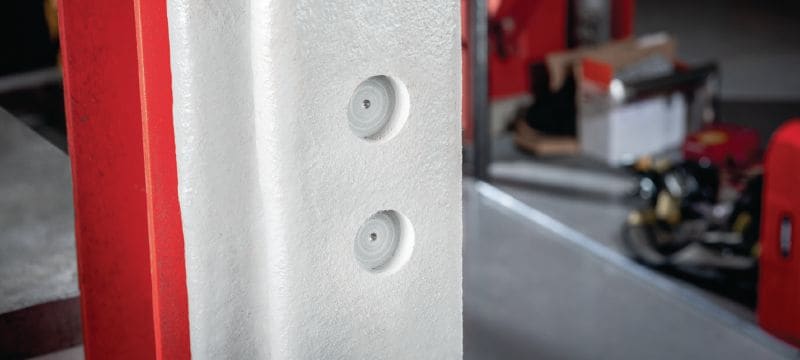 - Pomáha zabrániť kontaktu upevneného prvku s oceľovými nosníkmi alebo doskami – či už neošetrenými alebo s pasívnym protipožiarnym náterom (PFP)