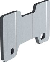 - Zloženie materiálu: Pätná doska: S280GD / Modif POSMAC-C, Stredná doska: S235JR – DIN EN 10025, Klzná doska: PA66 + GF30, Skrutka: oceľ triedy 8.8, matica: oceľ triedy 8